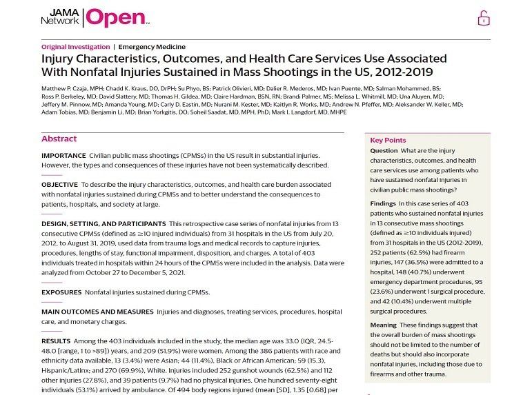 - Injury Characteristics, Outcomes, and Health Care Services Use Associated with Nonfatal Injuries Sustained in Mass Shootings in the US, 2012-2019. JAMA Netw Open. 2022; 5(5):e2213737.